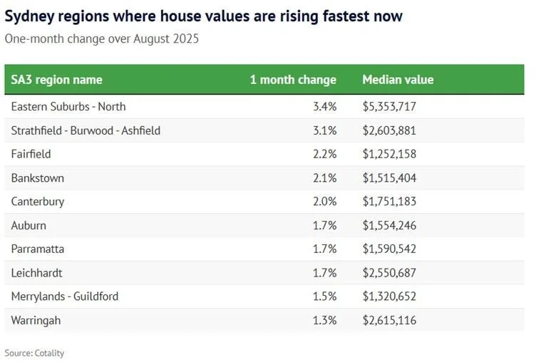 Sydney’s property market is showing renewed strength across multiple regions, with sharp monthly and quarterly gains recorded in August, according to Cotality.